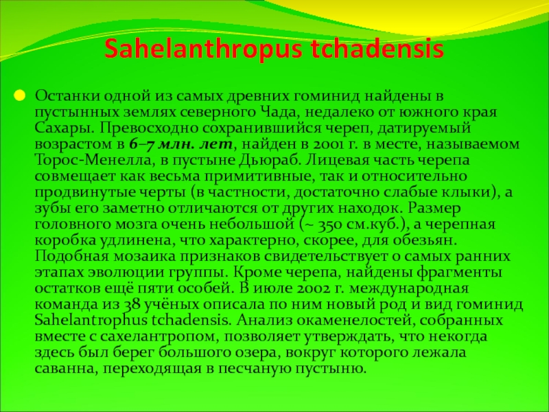 землях северного Чада, недалеко от южного края Сахары. Превосходно сохранившийся череп, датируемый возрастом в 6–7 млн. лет, найден в 2001 г. в месте, называемом Торос-Менелла, в пустыне Дьюраб. Лицевая часть черепа совмещает как весьма примитивные, так и относительно продвинутые черты (в частности, достаточно слабые клыки), а зубы его заметно отличаются от других находок. Размер головного мозга очень небольшой (~ 350 см.куб.), а черепная коробка удлинена, что характерно, скорее, для обезьян. Подобная мозаика признаков свидетельствует о самых ранних этапах эволюции группы. Кроме черепа, найдены фрагменты остатков ещё пяти особей. В июле 2002 г. международная команда из 38 учёных описала по ним новый род и вид гоминид Sahelantrophus tchadensis. Анализ окаменелостей, собранных вместе с сахелантропом, позволяет утверждать, что некогда здесь был берег большого озера, вокруг которого лежала саванна, переходящая в песчаную пустыню.