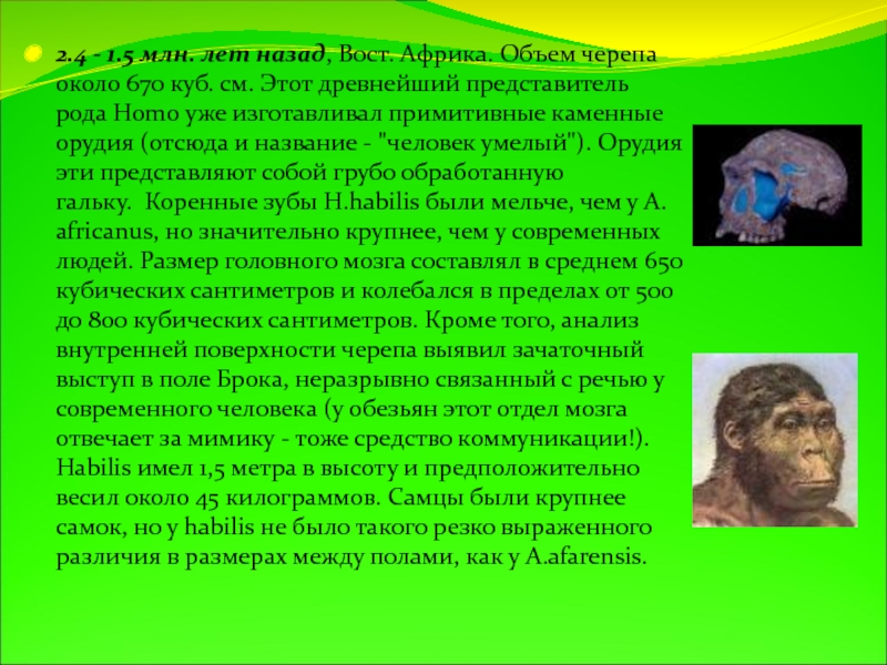 670 куб. см. Этот древнейший представитель рода Homo уже изготавливал примитивные каменные орудия (отсюда и название - "человек умелый"). Орудия эти представляют собой грубо обработанную гальку. Коренные зубы H.habilis были мельче, чем у A. africanus, но значительно крупнее, чем у современных людей. Размер головного мозга составлял в среднем 650 кубических сантиметров и колебался в пределах от 500 до 800 кубических сантиметров. Кроме того, анализ внутренней поверхности черепа выявил зачаточный выступ в поле Брока, неразрывно связанный с речью у современного человека (у обезьян этот отдел мозга отвечает за мимику - тоже средство коммуникации!). Habilis имел 1,5 метра в высоту и предположительно весил около 45 килограммов. Самцы были крупнее самок, но у habilis не было такого резко выраженного различия в размерах между полами, как у А.afarensis.