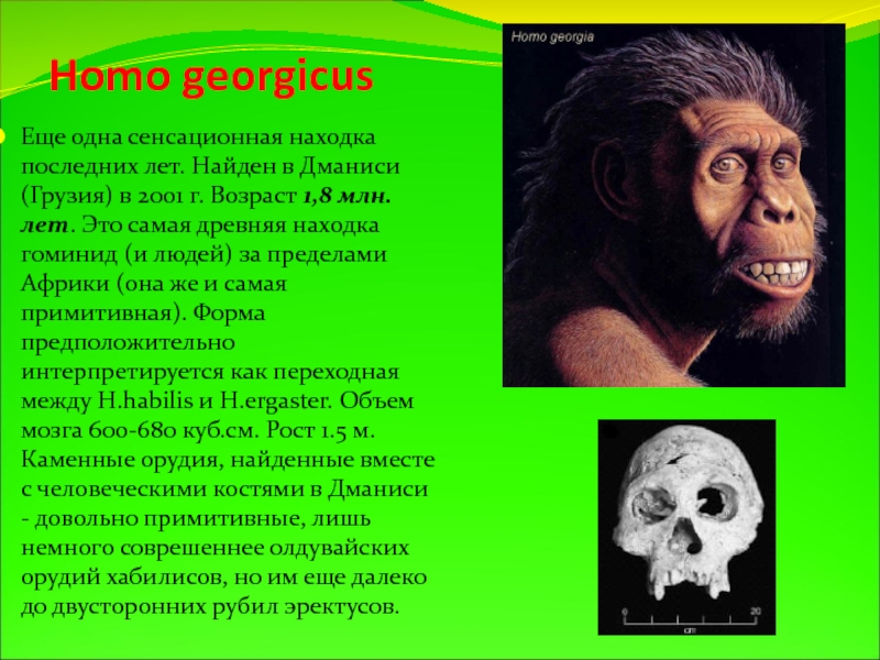 в 2001 г. Возраст 1,8 млн. лет. Это самая древняя находка гоминид (и людей) за пределами Африки (она же и самая примитивная). Форма предположительно интерпретируется как переходная между H.habilis и H.ergaster. Объем мозга 600-680 куб.см. Рост 1.5 м. Каменные орудия, найденные вместе с человеческими костями в Дманиси - довольно примитивные, лишь немного соврешеннее олдувайских орудий хабилисов, но им еще далеко до двусторонних рубил эректусов.