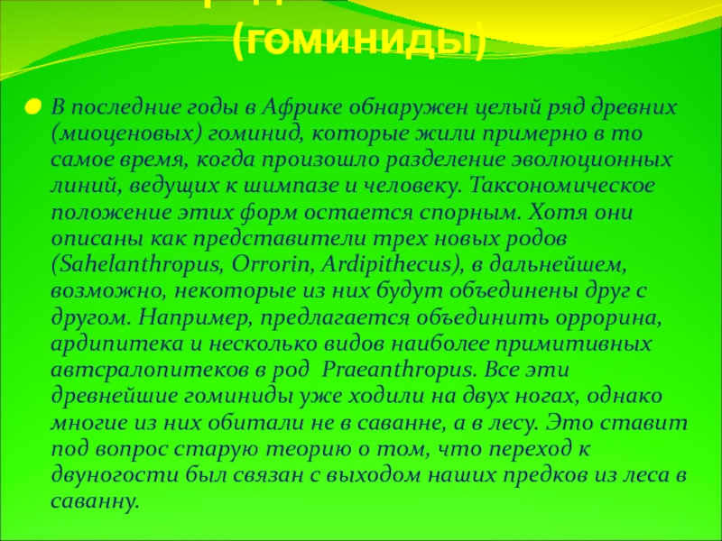 (миоценовых) гоминид, которые жили примерно в то самое время, когда произошло разделение эволюционных линий, ведущих к шимпазе и человеку. Таксономическое положение этих форм остается спорным. Хотя они описаны как представители трех новых родов (Sahelanthropus, Orrorin, Ardipithecus), в дальнейшем, возможно, некоторые из них будут объединены друг с другом. Например, предлагается объединить оррорина, ардипитека и несколько видов наиболее примитивных автсралопитеков в род Praeanthropus. Все эти древнейшие гоминиды уже ходили на двух ногах, однако многие из них обитали не в саванне, а в лесу. Это ставит под вопрос старую теорию о том, что переход к двуногости был связан с выходом наших предков из леса в саванну.