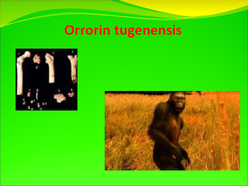 раскопках в Кении неподалеку от Great Rift Valley (Aiello & Collard, 2001). Останки существа, получившего прозвище Человек Миллениума, но официально названного Orrorin tugenensis, состоят из костей как минимум пяти особей и находились в толще горных пород, возраст которых превышает 6 миллионов лет. По своим размерам данный вид схож с современными шимпанзе. Судя по останкам скелетов, можно предположить, что он проворно лазил по деревьям, а также передвигался по земле на нижних конечностях. Строение зубов подсказывает, что данный вид питался растительной пищей, типичной для обезьян, однако уменьшенные резцы и крупные коренные зубы свидетельствуют об эволюционных тенденциях, согласующихся с человеческой эволюцией.