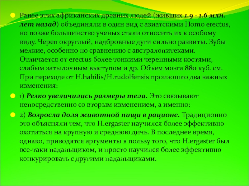 назад) объединяли в один вид с азиатскими Homo erectus, но позже большинство ученых стали относить их к особому виду. Череп округлый, надбровные дуги сильно развиты. Зубы мелкие, особенно по сравнению с австралопитеками. Отличается от erectus более тонкими черепными костями, слабым затылочным выступом и др. Объем мозга 880 куб. см. При переходе от H.habilis/H.rudolfensis произошло два важных изменения: