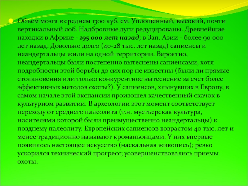лоб. Надбровные дуги редуцированы. Древнейшие находки в Африке - 195 000 лет назад; в Зап. Азии - более 90 000 лет назад. Довольно долго (40-28 тыс. лет назад) сапиенсы и неандертальцы жили на одной территории. Вероятно, неандертальцы были постепенно вытеснены сапиенсами, хотя подробности этой борьбы до сих пор не известны (были ли прямые столкновения или только конкурентное вытеснение за счет более эффективных методов охоты?). У сапиенсов, хлынувших в Европу, в самом начале этой экспансии произошел качественный скачок в культурном развитии. В археологии этот момент соответствует переходу от среднего палеолита (т.н. мустьерская культура, носителями которой были преимущественно неандертальцы) к позднему палеолиту. Европейских сапиенсов возрастом 40 тыс. лет и менее традиционно называют кроманьонцами. У них впервые появилось настоящее искусство (наскальная живопись); резко ускорился технический прогресс; усовершенствовались приемы охоты.