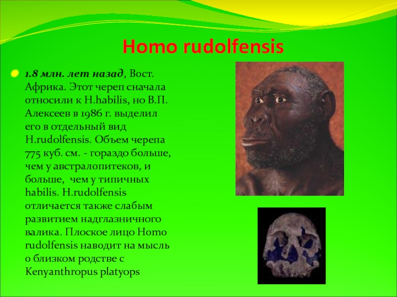 к H.habilis, но В.П.Алексеев в 1986 г. выделил его в отдельный вид H.rudolfensis. Объем черепа 775 куб. см. - гораздо больше, чем у австралопитеков, и больше, чем у типичных habilis. H.rudolfensis отличается также слабым развитием надглазничного валика. Плоское лицо Homo rudolfensis наводит на мысль о близком родстве с Kenyanthropus platyops