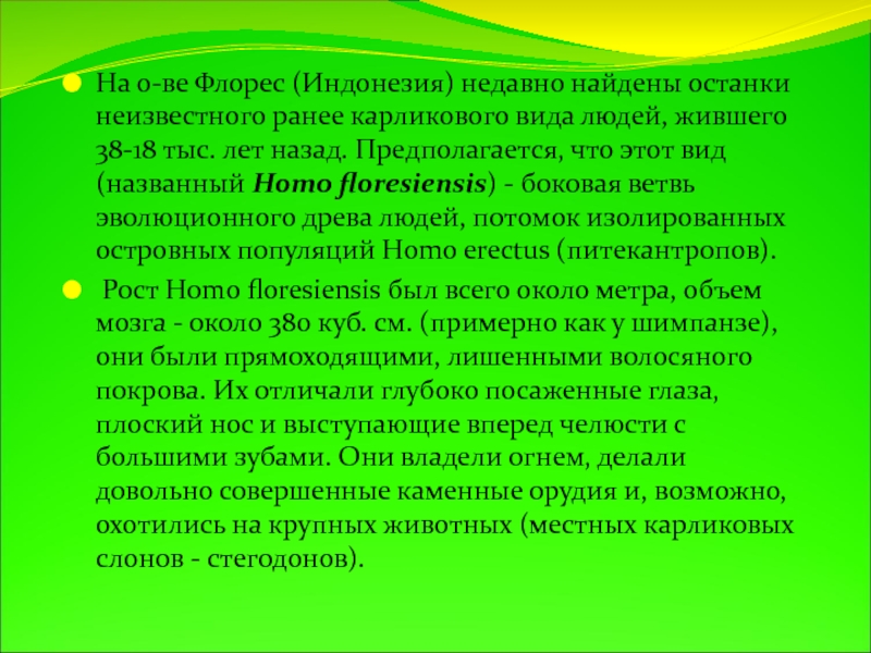людей, жившего 38-18 тыс. лет назад. Предполагается, что этот вид (названный Homo floresiensis) - боковая ветвь эволюционного древа людей, потомок изолированных островных популяций Homo erectus (питекантропов).