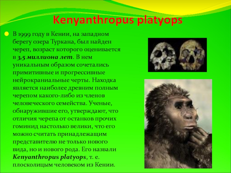 найден череп, возраст которого оценивается в 3,5 миллиона лет. В нем уникальным образом сочетались примитивные и прогрессивные нейрокраниальные черты. Находка является наиболее древним полным черепом какого-либо из членов человеческого семейства. Ученые, обнаружившие его, утверждают, что отличия черепа от останков прочих гоминид настолько велики, что его можно считать принадлежащим представителю не только нового вида, но и нового рода. Его назвали Kenyanthropus platyops, т. е. плосколицым человеком из Кении.