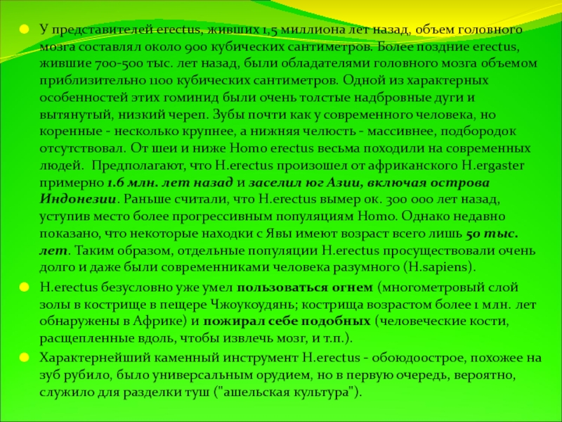 составлял около 900 кубических сантиметров. Более поздние erectus, жившие 700-500 тыс. лет назад, были обладателями головного мозга объемом приблизительно 1100 кубических сантиметров. Одной из характерных особенностей этих гоминид были очень толстые надбровные дуги и вытянутый, низкий череп. Зубы почти как у современного человека, но коренные - несколько крупнее, а нижняя челюсть - массивнее, подбородок отсутствовал. От шеи и ниже Homo erectus весьма походили на современных людей. Предполагают, что H.erectus произошел от африканского H.ergaster примерно 1.6 млн. лет назад и заселил юг Азии, включая острова Индонезии. Раньше считали, что H.erectus вымер ок. 300 000 лет назад, уступив место более прогрессивным популяциям Homo. Однако недавно показано, что некоторые находки с Явы имеют возраст всего лишь 50 тыс. лет. Таким образом, отдельные популяции H.erectus просуществовали очень долго и даже были современниками человека разумного (H.sapiens).