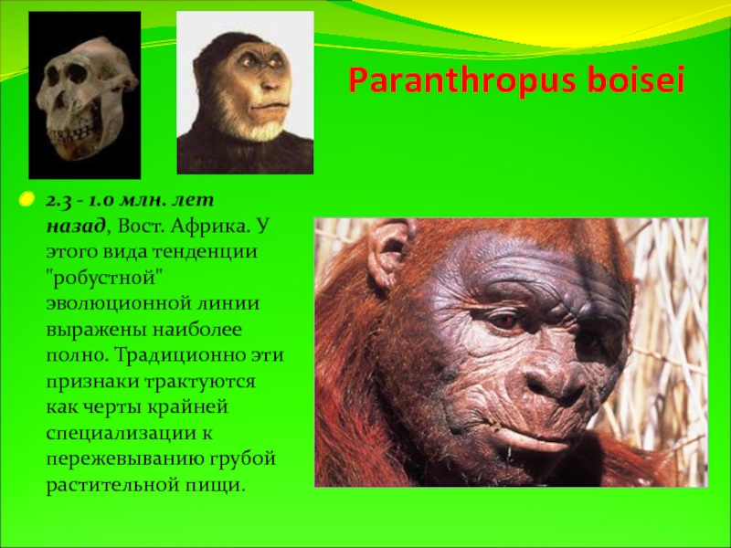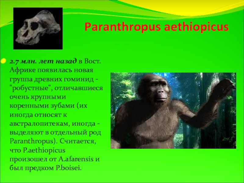 древних гоминид - "робустные", отличавшиеся очень крупными коренными зубами (их иногда относят к австралопитекам, иногда - выделяют в отдельный род Paranthropus). Считается, что P.aethiopicus произошел от A.afarensis и был предком P.boisei.