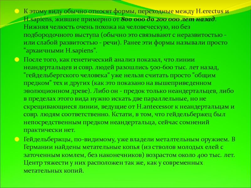 Слайд 35К этому виду обычно относят формы, переходные между H.erectus и H.sapiens,