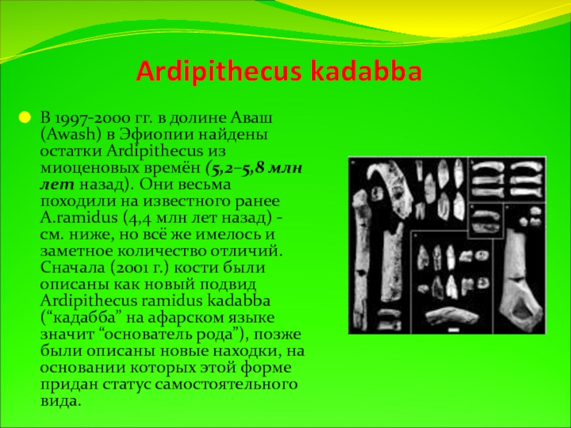 найдены остатки Ardipithecus из миоценовых времён (5,2–5,8 млн лет назад). Они весьма походили на известного ранее A.ramidus (4,4 млн лет назад) - см. ниже, но всё же имелось и заметное количество отличий. Сначала (2001 г.) кости были описаны как новый подвид Ardipithecus ramidus kadabba (“кадабба” на афарском языке значит “основатель рода”), позже были описаны новые находки, на основании которых этой форме придан статус самостоятельного вида.
