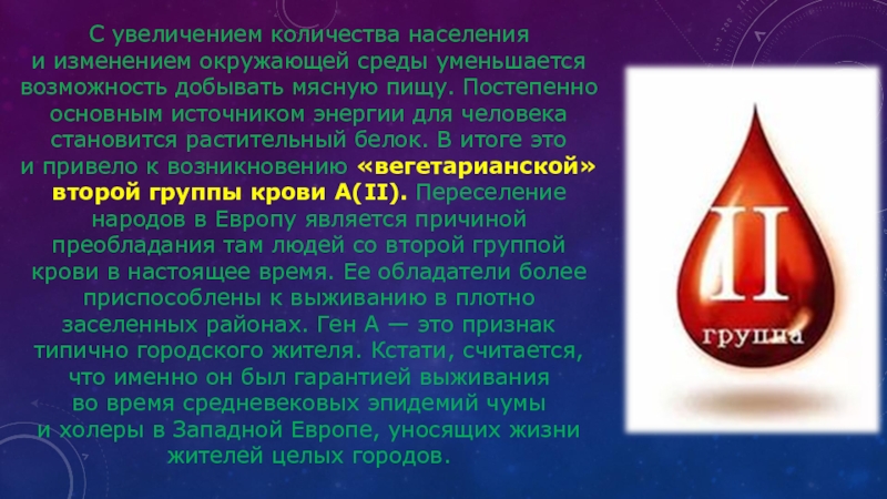 Постепенно основным источником энергии для человека становится растительный белок. В итоге это и привело к возникновению «вегетарианской» второй группы крови А(II). Переселение народов в Европу является причиной преобладания там людей со второй группой крови в настоящее время. Ее обладатели более приспособлены к выживанию в плотно заселенных районах. Ген А — это признак типично городского жителя. Кстати, считается, что именно он был гарантией выживания во время средневековых эпидемий чумы и холеры в Западной Европе, уносящих жизни жителей целых городов.