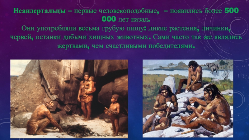 Неандертальцы – первые человекоподобные,  – появились более 500 000 лет назад. Они употребляли весьма грубую пищу: дикие растения,