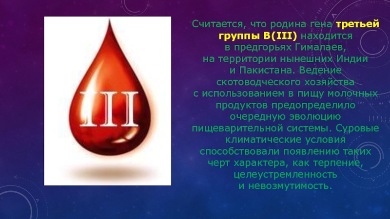 Слайд 8Считается, что родина гена третьей группы В(III) находится в предгорьях Гималаев, на территории