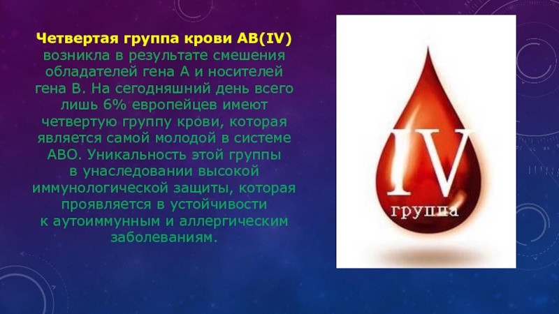 гена В. На сегодняшний день всего лишь 6% европейцев имеют четвертую группу крови, которая является самой молодой в системе АВО. Уникальность этой группы в унаследовании высокой иммунологической защиты, которая проявляется в устойчивости к аутоиммунным и аллергическим заболеваниям.