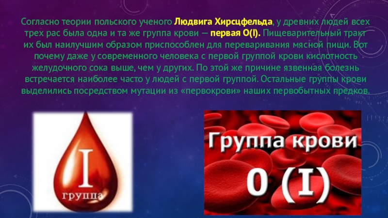 Согласно теории польского ученого Людвига Хирсцфельда, у древних людей всех трех рас была одна и та же группа крови — первая