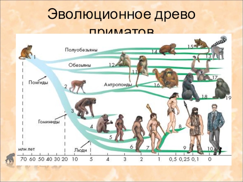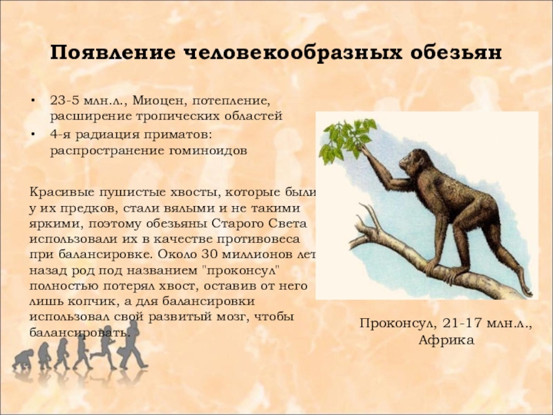 Красивые пушистые хвосты, которые были у их предков, стали вялыми и не такими яркими, поэтому обезьяны Старого Света использовали их в качестве противовеса при балансировке. Около 30 миллионов лет назад род под названием "проконсул" полностью потерял хвост, оставив от него лишь копчик, а для балансировки использовал свой развитый мозг, чтобы балансировать.