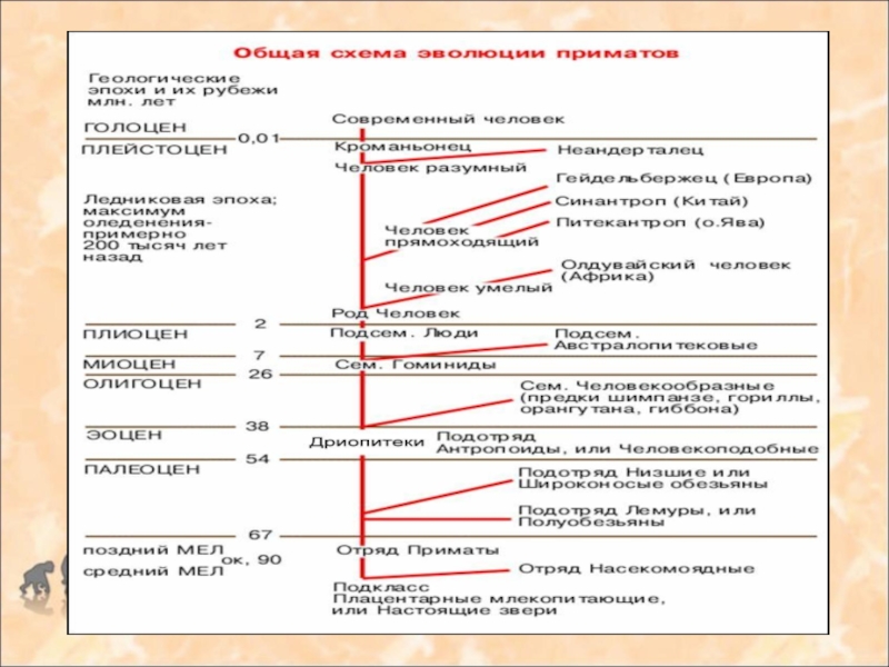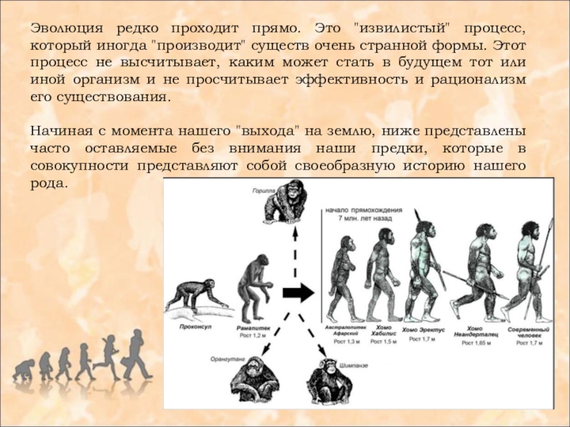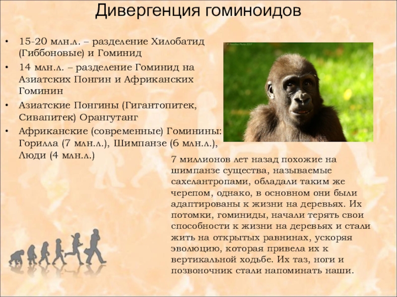 7 миллионов лет назад похожие на шимпанзе существа, называемые сахелантропами, обладали таким же черепом, однако, в основном они были адаптированы к жизни на деревьях. Их потомки, гоминиды, начали терять свои способности к жизни на деревьях и стали жить на открытых равнинах, ускоряя эволюцию, которая привела их к вертикальной ходьбе. Их таз, ноги и позвоночник стали напоминать наши.
