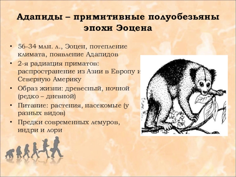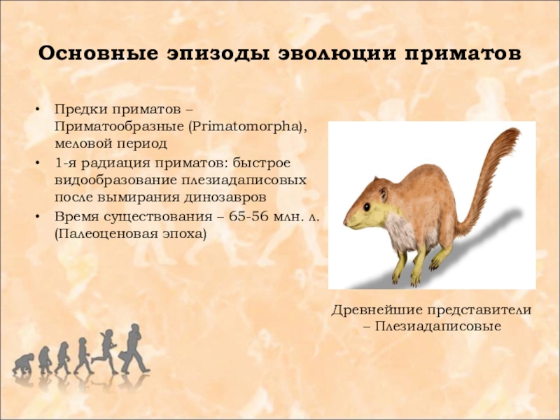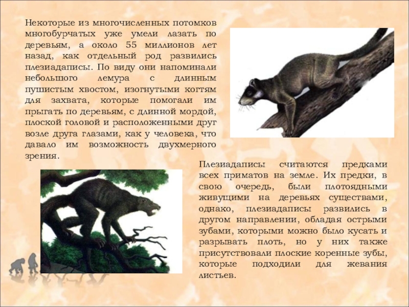 Плезиадаписы считаются предками всех приматов на земле. Их предки, в свою очередь, были плотоядными живущими на деревьях существами, однако, плезиадаписы развились в другом направлении, обладая острыми зубами, которыми можно было кусать и разрывать плоть, но у них также присутствовали плоские коренные зубы, которые подходили для жевания листьев.