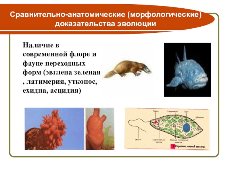(эвглена зеленая , латимерия, утконос, ехидна, асцидия)
