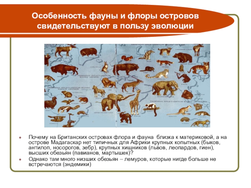 Слайд 28Особенность фауны и флоры островов свидетельствуют в пользу эволюции