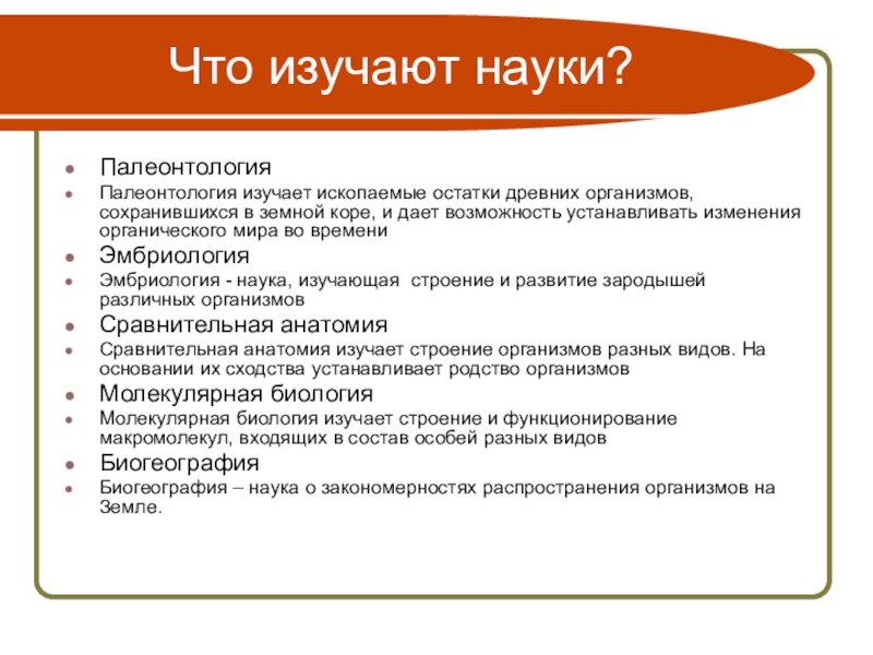 Это данные генетики, палеонтологии, молекулярной биологии, селекции, эмбриологии, биогеографии, экологии, цитологии, сравнительной анатомии и других наук.