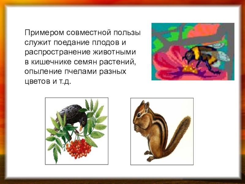 Примером совместной пользы служит поедание плодов и распространение животными в кишечнике семян растений, опыление пчелами разных цветов и т.д.