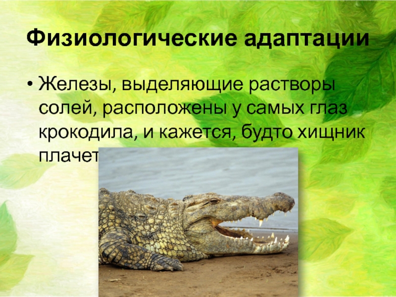 Физиологические адаптацииЖелезы, выделяющие растворы солей, расположены у самых глаз крокодила, и кажется, будто хищник плачет.