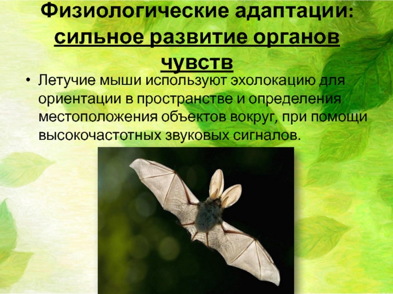 Физиологические адаптации: сильное развитие органов чувствЛетучие мыши используют эхолокацию для ориентации в пространстве и определения местоположения объектов