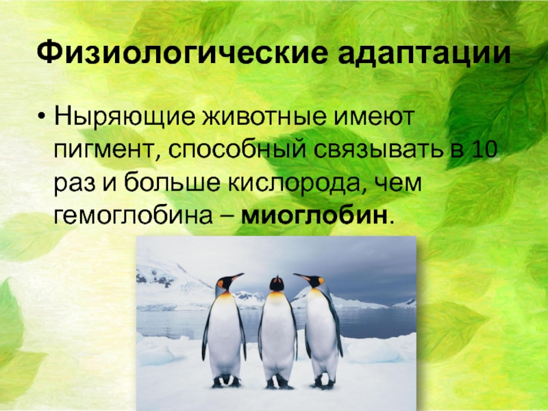 Физиологические адаптацииНыряющие животные имеют пигмент, способный связывать в 10 раз и больше кислорода, чем гемоглобина – миоглобин.