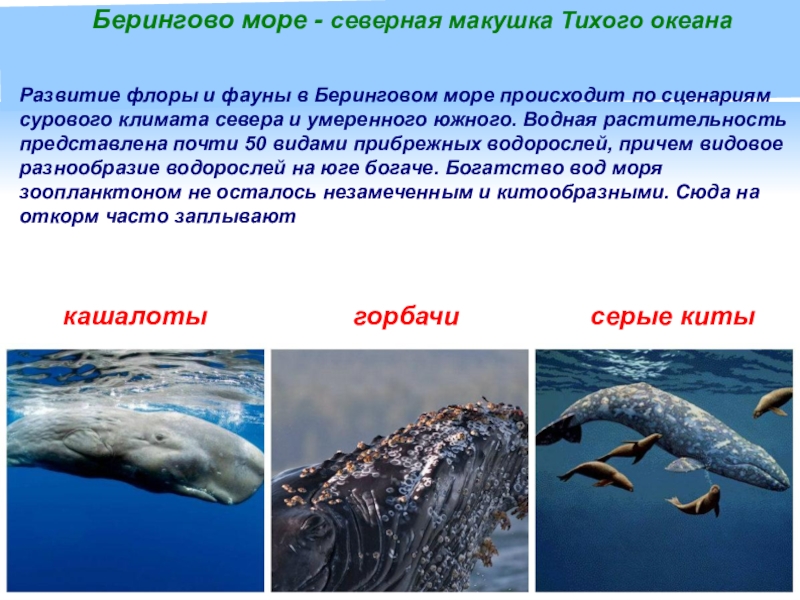 Развитие флоры и фауны в Беринговом море происходит по сценариям сурового климата севера и умеренного южного. Водная растительность представлена почти 50 видами прибрежных водорослей, причем видовое разнообразие водорослей на юге богаче. Богатство вод моря зоопланктоном не осталось незамеченным и китообразными. Сюда на откорм часто заплывают