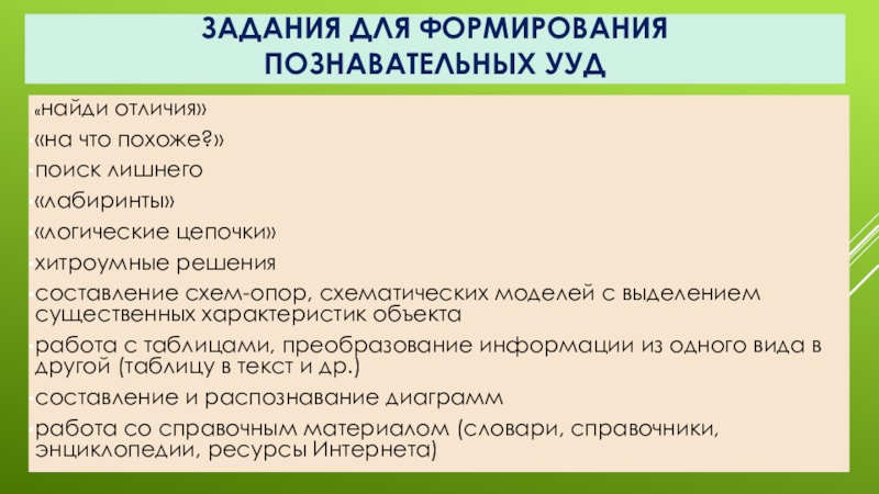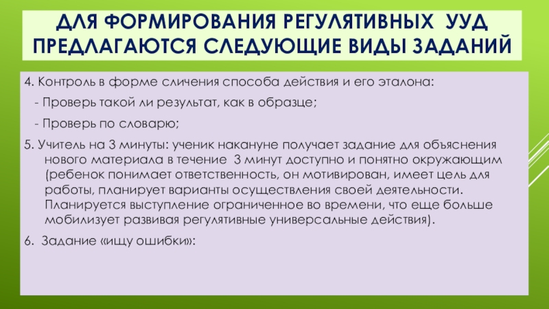 Слайд 11Для формирования регулятивных УУД предлагаются следующие виды заданий