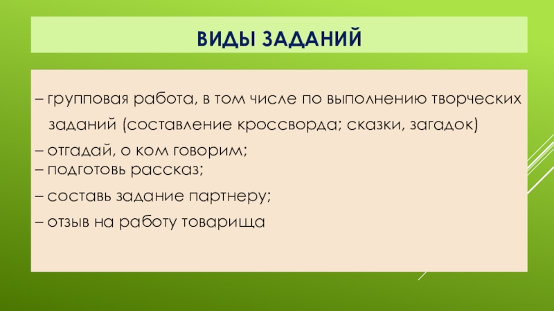 (составить сказку, кроссворд, ребус, мини-сочинение, изготовление аппликации, подбор интересных фактов по теме, подготовка и защита сообщения, презентации и др.)
