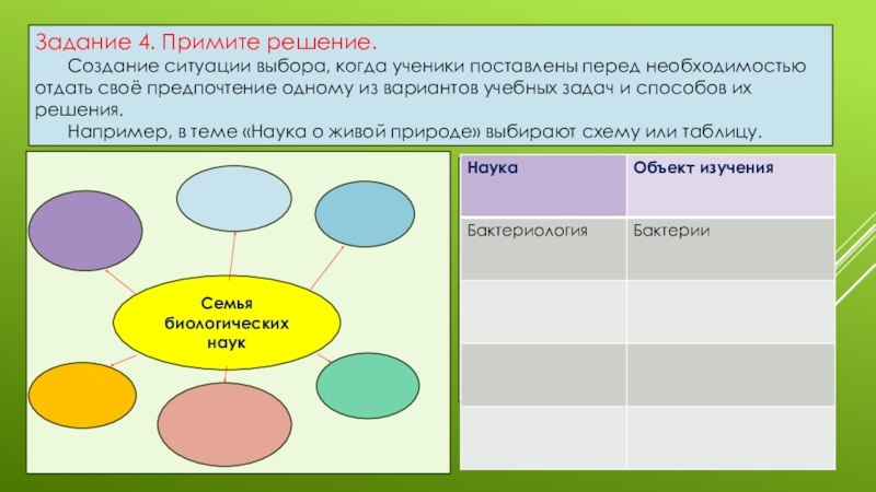 Например, в теме «Наука о живой природе» выбирают схему или таблицу.
