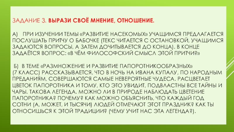 (7 класс) рассказывается, что в ночь на Ивана Купалу, по народным преданиям, совершаются самые невероятные чудеса. Расцветает цветок папоротника и тому, кто это увидит, подвластны все тайны и чары. Такова легенда. Можно ли в природе наблюдать цветение папоротника? Почему? Как можно объяснить, что каждый год сотни (а, может, и тысячи) людей отмечают этот праздник? Как ты относишься к этой традиции? (Чему учит нас эта легенда?).