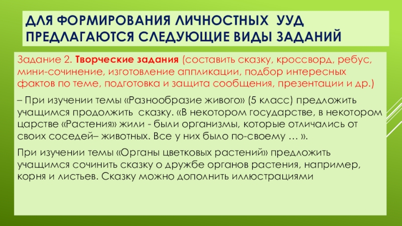 Слайд 5Для формирования личностных УУД предлагаются следующие виды заданий