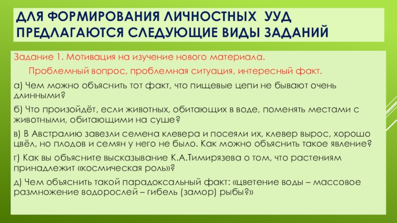 Слайд 4Для формирования личностных УУД предлагаются следующие виды заданий