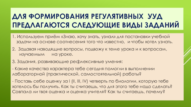 Слайд 12Для формирования регулятивных УУД предлагаются следующие виды заданий