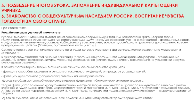 Русский биолог И.И.Мечников является основоположником теории иммунитета. Им разработана фагоцитарная теория иммунитета, которая объясняет сложную работу системы иммунитета. Он обосновал учение о фагоцитозе и фагоцитах. Доказал, что фагоцитоз - явление универсальное, наблюдается у всех животных, включая простейших, и проявляется по отношению ко всем чужеродным веществам (бактерии, органические частицы и т. д.).