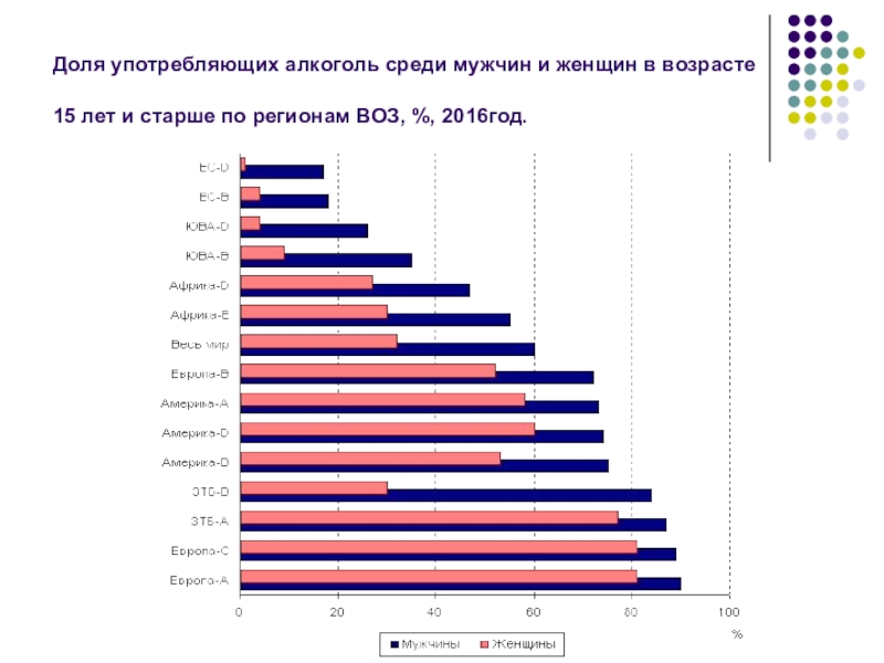 Доля употребляющих алкоголь среди мужчин и женщин в возрасте 15 лет и старше по регионам ВОЗ, %,