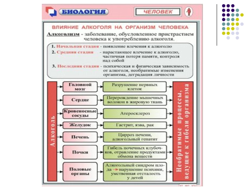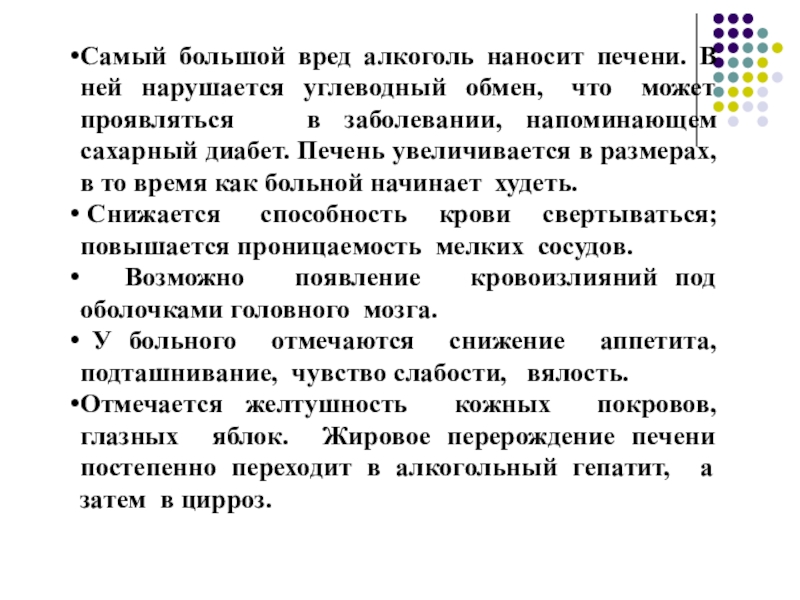 Самый большой вред алкоголь наносит печени. В ней нарушается углеводный обмен,  что  может  проявляться