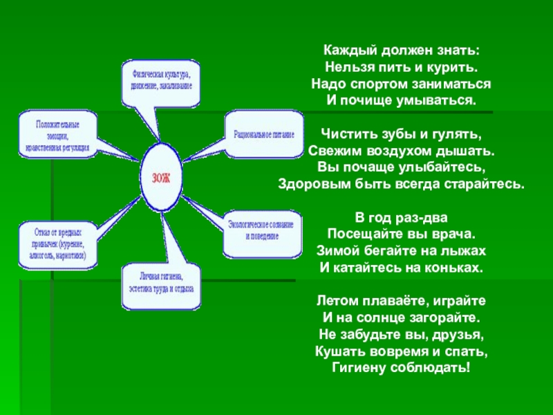 Каждый должен знать:Нельзя пить и курить.Надо спортом заниматьсяИ почище умываться. Чистить зубы и гулять,Свежим воздухом дышать.Вы почаще улыбайтесь,Здоровым быть всегда старайтесь. В год раз-дваПосещайте вы врача.Зимой бегайте на лыжахИ катайтесь на коньках. Летом плаваёте, играйтеИ на солнце загорайте.Не забудьте