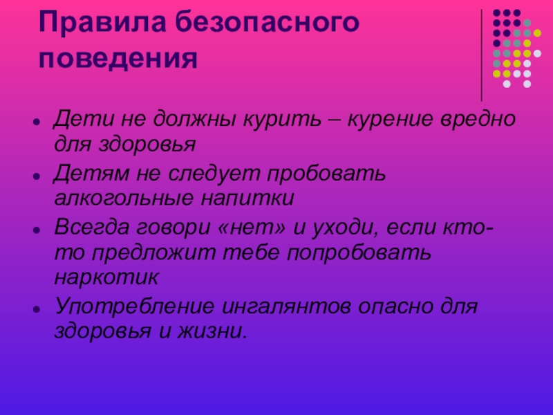 Правила безопасного поведенияДети не должны курить – курение вредно для здоровьяДетям не следует пробовать алкогольные напиткиВсегда говори