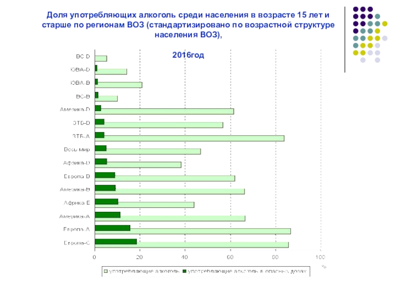 Доля употребляющих алкоголь среди населения в возрасте 15 лет и старше по регионам ВОЗ (стандартизировано по возрастной