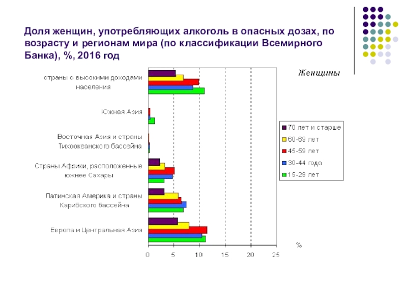 Доля женщин, употребляющих алкоголь в опасных дозах, по возрасту и регионам мира (по классификации Всемирного Банка), %,
