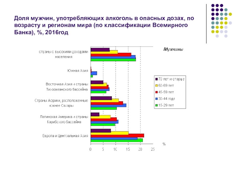Доля мужчин, употребляющих алкоголь в опасных дозах, по возрасту и регионам мира (по классификации Всемирного Банка), %,