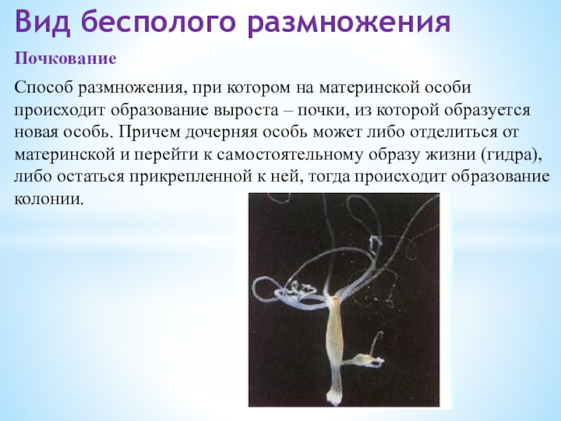 выроста – почки, из которой образуется новая особь. Причем дочерняя особь может либо отделиться от материнской и перейти к самостоятельному образу жизни (гидра), либо остаться прикрепленной к ней, тогда происходит образование колонии.