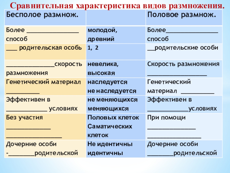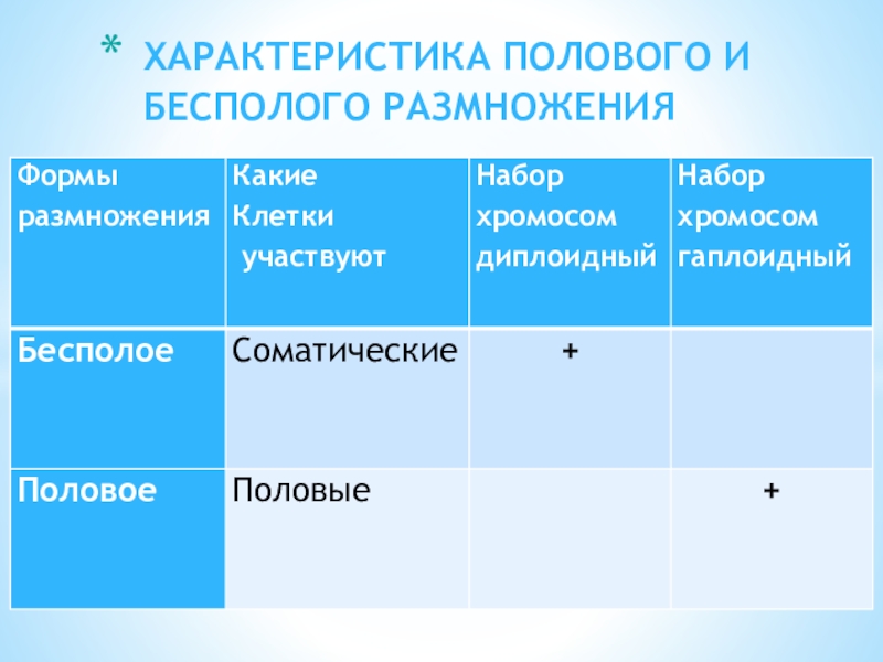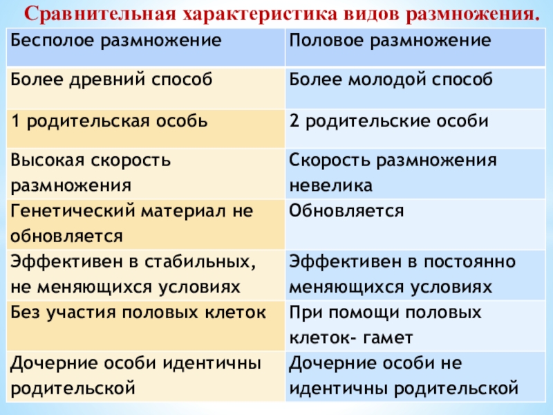 Слайд 7ХАРАКТЕРИСТИКА ПОЛОВОГО И БЕСПОЛОГО РАЗМНОЖЕНИЯ