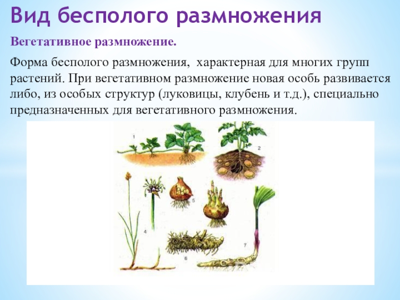При вегетативном размножение новая особь развивается либо, из особых структур (луковицы, клубень и т.д.), специально предназначенных для вегетативного размножения.