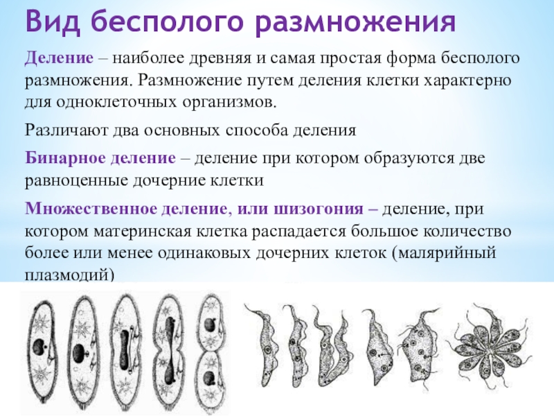 размножения. Размножение путем деления клетки характерно для одноклеточных организмов.