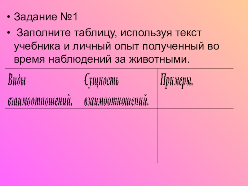 Задание №1 Заполните таблицу, используя текст учебника и личный опыт полученный во время наблюдений за животными.